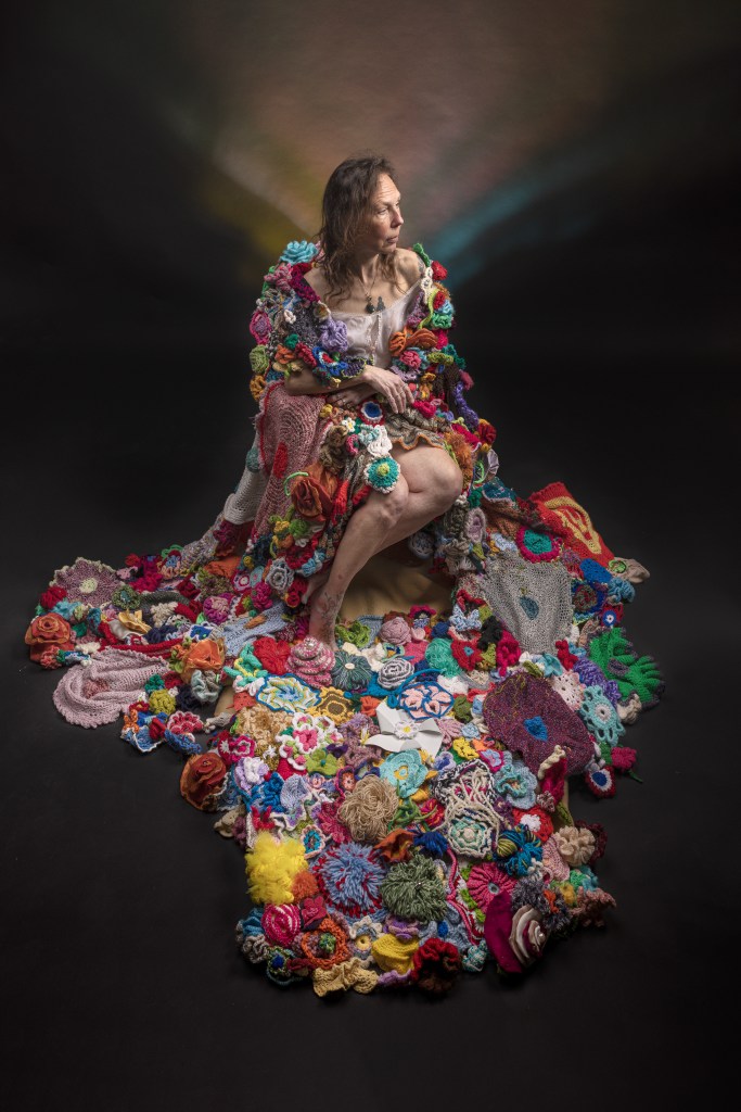 Tijdens Open Ateliers Vlaardingen in 2022 exposeerde ik samen met fotograaf en muzikant Richard Beukelaar. Dat weekend werd het al snel duidelijk dat we zouden gaan samenwerken. De magie was er. Cora van der Zijde bezocht diezelfde expositie en liet toen weten dat ze zich wel in het bloemenkleed ‘Samen breien we het voor elkaar’ wilde wikkelen. Toen wist ze nog niet dat dat op 16 april 2023 echt ging gebeuren, met deze foto als resultaat.