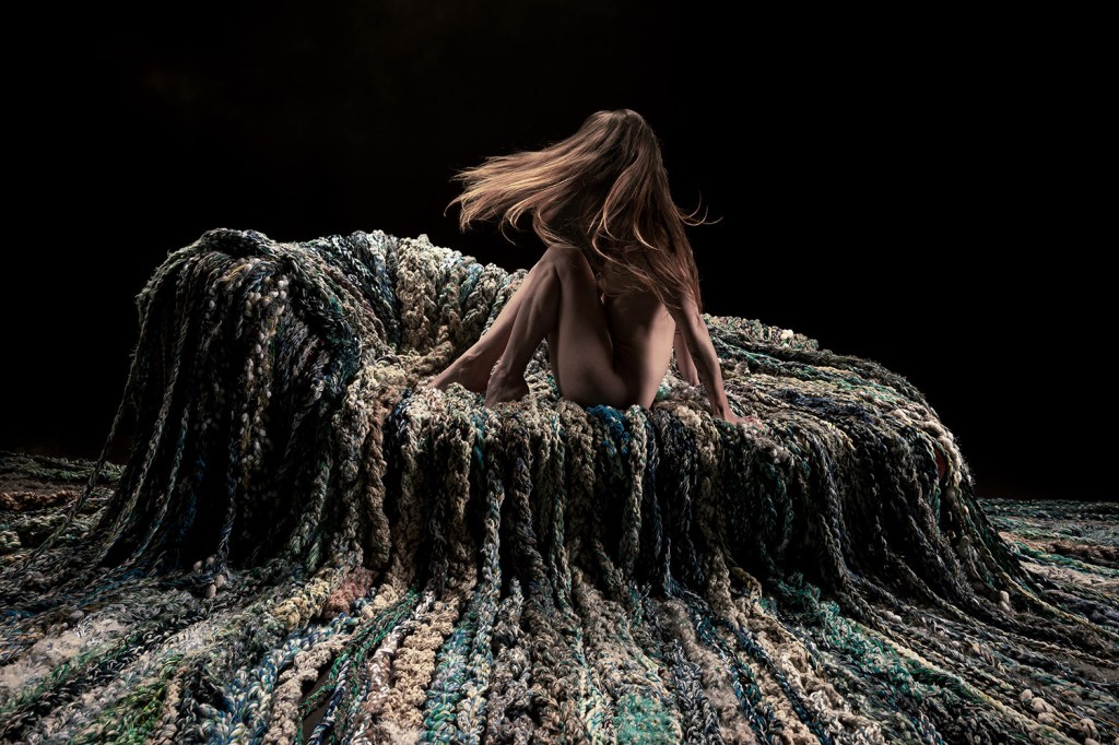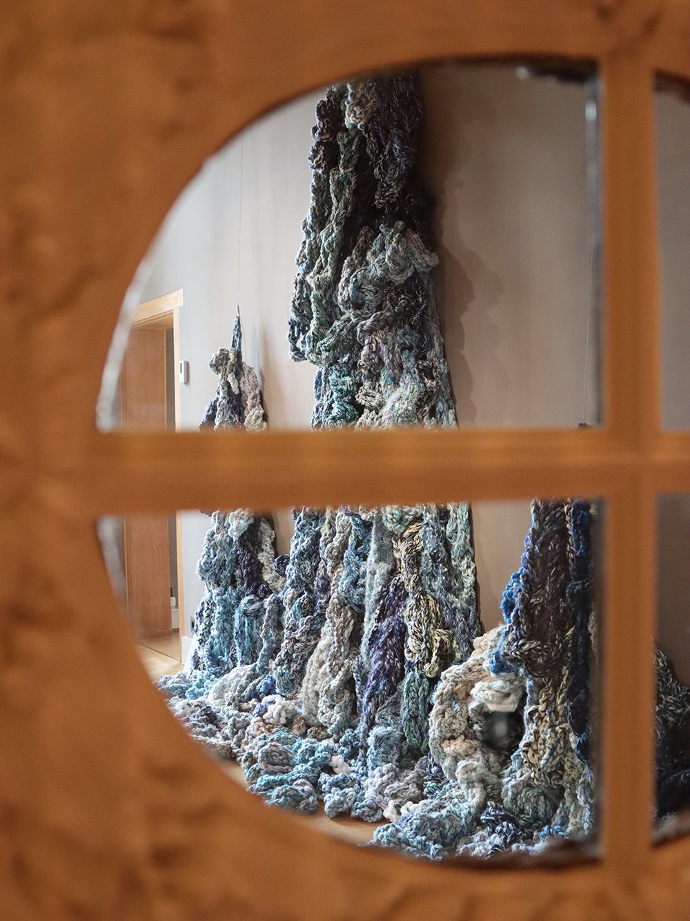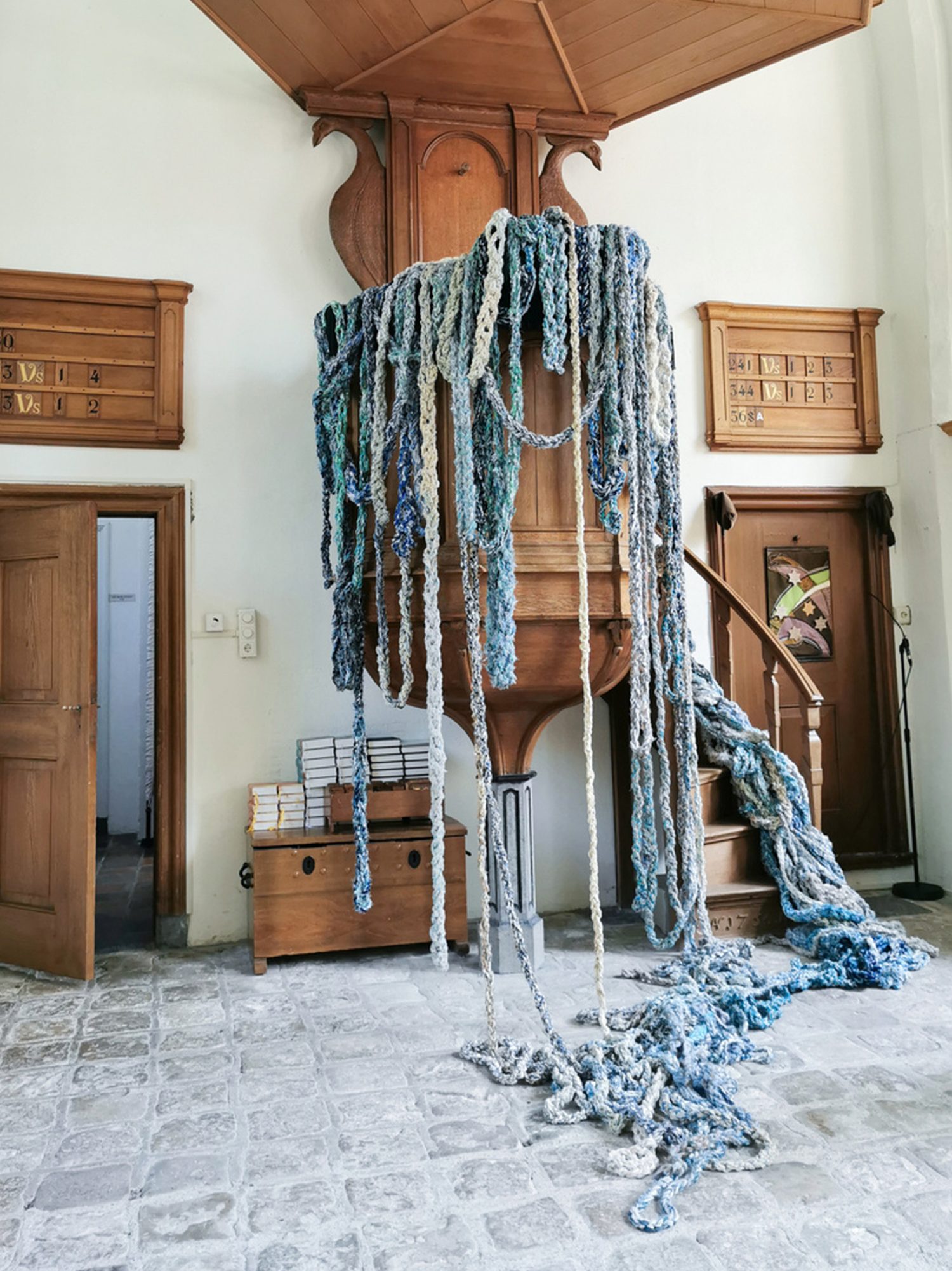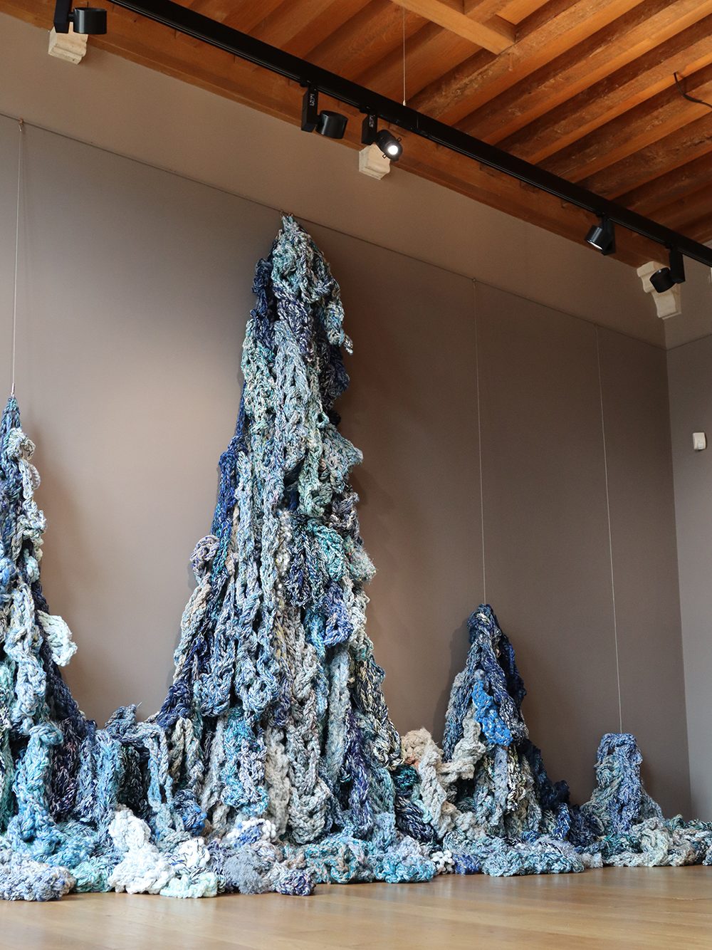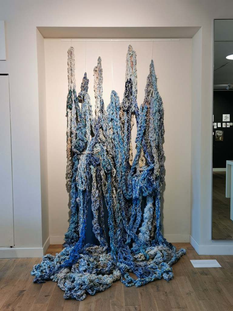 Gedurende jaren verzamelde zich allerlei blauwe “wol” in mijn atelier. Het vroeg erom om water te worden. Ik zet wol tussen aanhalingstekens want 95 % van al het materiaal in dit object is synthetisch, eigenlijk plastic. Ik begreep dat dit project mij het verhaal van verborgen plastic, zwerfvuil en plastic in de oceaan wil vertellen, maar ook de worsteling van het teveel of te weinig water in de wereld.