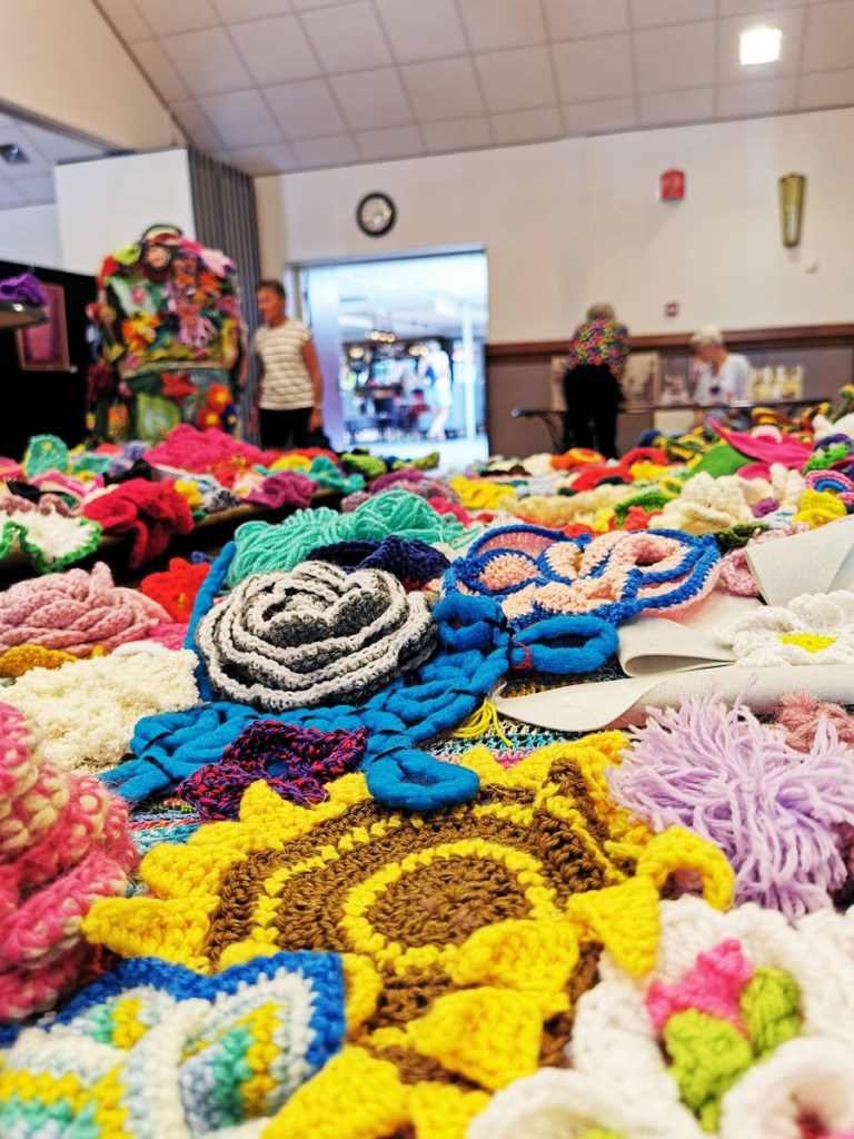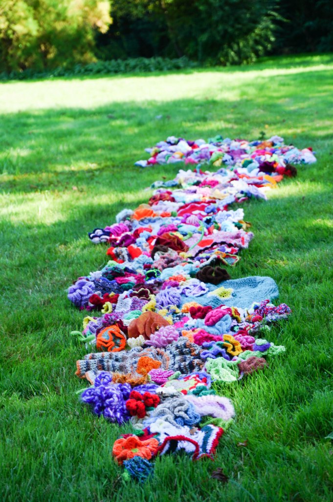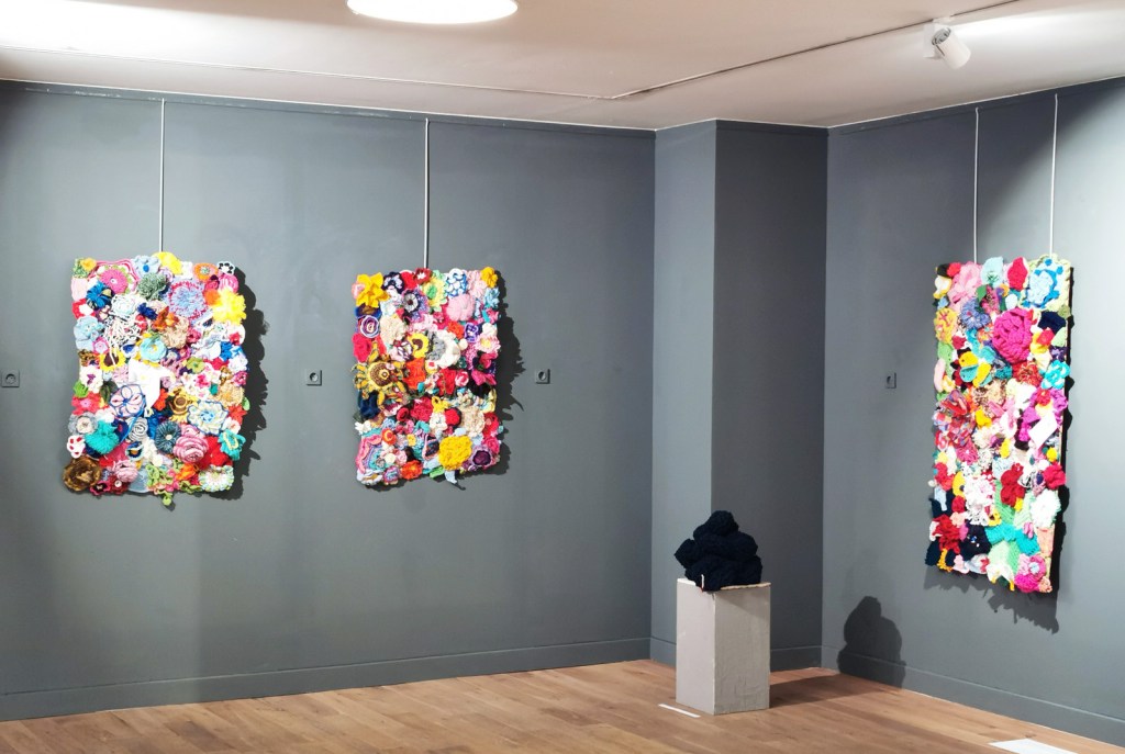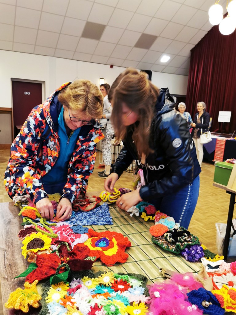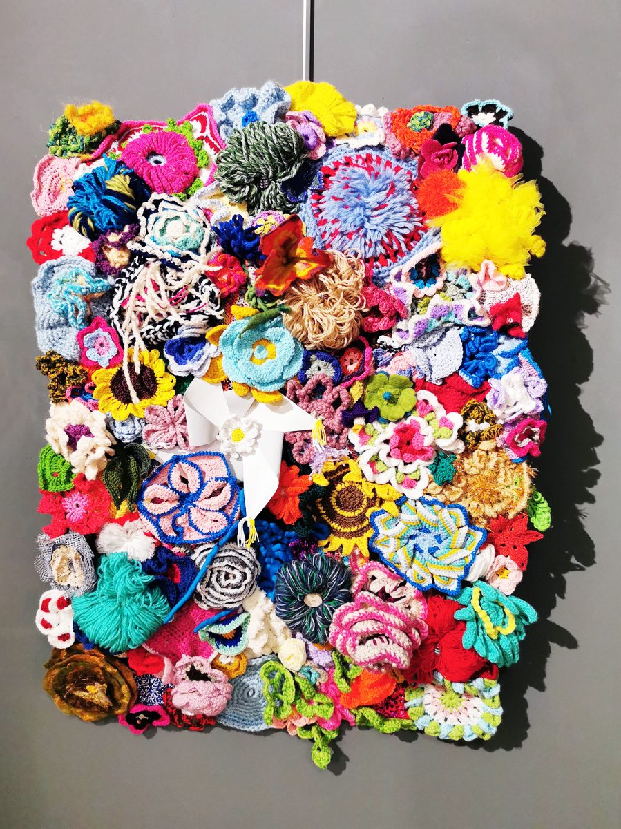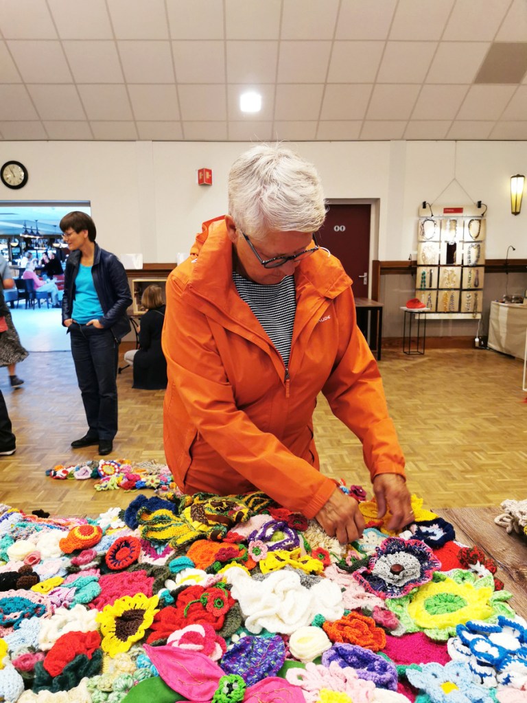De grote bloemen zijn gehaakt door een mevrouw die maar één hand beschikbaar heeft om te haken. Op de dagbesteding haakte ze bloemen voor ons. Ze stak de haaknaald onder haar brace en haakt door haar pols te bewegen. Het was heerlijk om haar te zien stralen omdat ze meedeed aan het project. Voor schilders is er vaker een mogelijkheid om te exposeren maar dit keer kon zij in het middelpunt staan.