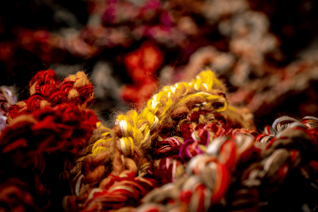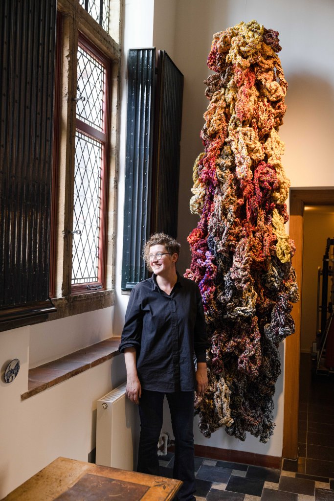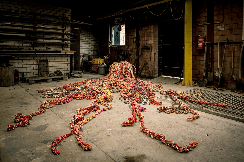 De parallelexpositie Hete Vuren in het Markiezenhof was voor mij de aanleiding om Vuur te maken. Het materiaal had zich al meerdere jaren in mijn atelier verzameld en was onder andere overgebleven na het maken van mijn objecten Het Stroomt en Golven. Ik kreeg zeven bananendozen vol wol gedoneerd. De dozen wol waren een erfenis van een overleden textielkunstenares. Haar wol bracht mij precies de mooie kleuren die ik nodig had voor Vuur.